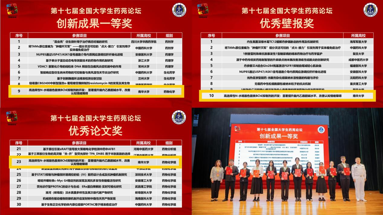 在刚刚落幕的第十七届“全国大学生药苑论坛”总决赛中,bw必威西汉姆联官网学子再创佳绩。在王震教授和彭雪博士的指导下,由曾羡麟、唐雅庭、李羿翰、巫清玲、向甜杏五位同学组成的参赛团队,凭借项目《高选择性N-水杨酸色胺类BChE抑制剂的开发:具备提升脑内乙酰胆碱并改善认知情绪障碍的能力》,从全国126所高校的279项参赛作品中脱颖而出,一举夺得创新成果一等奖,并同时荣获优秀论文奖与优秀壁报奖,展现了南华药学人的卓越科研实力与创新风采。