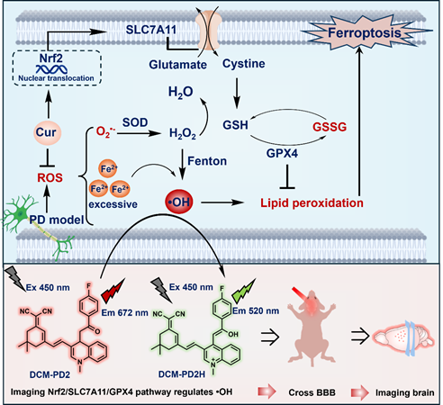 帕金森病(Parkinson's disease, PD)是一种常见的神经退行性疾病,其发病机制复杂。近年来,铁死亡作为一种由铁调控、脂质过氧化驱动的细胞死亡方式,被认为与PD的发生发展密切相关。羟基自由基(•OH)的过量积累会引起严重神经损伤,并与多种神经退行性疾病相关,但其在PD中的作用尚未得到明确阐释。受限于缺乏有效的检测工具,目前尚无能够在铁死亡及PD过程中实时监测•OH动态变化的荧光探针。在此背景下,bw必威西汉姆联官网医用荧光材料团队设计并合成了一系列•OH响应型比率近红外(NIR)荧光探针(DCM-PD1~8),用于监测铁死亡介导的PD中•OH水平。研究发现,其中DCM-PD2表现出最佳的光物理性质,具备高灵敏度(检测限约22.9 nM)、优异选择性、30分钟以内的快速响应速度及良好的深层组织穿透能力。凭借出色的膜通透性和低毒性,DCM-PD2可同时用于追踪内源性和外源性•OH变化。更为重要的是,该探针能够顺利穿越血脑屏障(BBB),首次实现对PD模型小鼠脑部•OH活性的实时成像,结果显示PD小鼠脑区•OH水平显著升高。此外,利用DCM-PD2成功揭示了姜黄素(Cur)在PD模型中的神经保护作用,其主要通过Nrf2/SLC7A11信号通路调控铁死亡过程,从而减轻神经损伤。该研究不仅为理解•OH在PD中的作用机制提供了新的证据,也表明DCM-PD2是一种可靠且高效的工具,有望应用于铁死亡介导的PD的精准诊断与治疗。研究成果为探索新型PD诊断成像手段和干预策略提供了重要理论依据和实验基础。