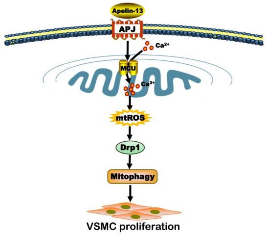 动脉粥样硬化(AS)的核心病理特征之一是血管平滑肌细胞(VSMCs)异常增殖,其机制与线粒体功能紊乱密切相关。Apelin是G蛋白偶联受体APJ的内源性配体,bw必威西汉姆联官网陈临溪教授团队前期发现Apelin-13(Apelin的活性片段)可通过线粒体自噬(mitophagy)促进VSMCs增殖(Journal of Cellular Physiology.2019,234(6).866),但Apelin-13如何调控线粒体自噬的分子机制尚未完全明确。线粒体钙单向转运体(MCU)是线粒体内膜上负责钙摄取的关键通道,其介导的线粒体稳态失衡与细胞增殖、氧化应激密切相关。基于此,陈临溪教授团队围绕MCU依赖性线粒体钙超载开展了持续性的研究工作,并取得了一定成果(Vascul Pharmacol. 2022;144:106979.)。