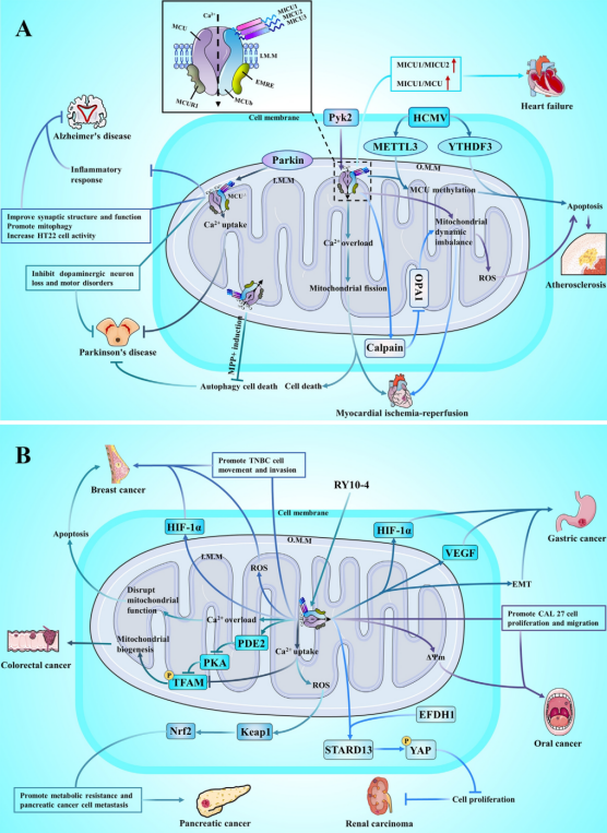 尽管MCU通过影响线粒体内Ca2+与Fe3+稳态,导致心血管疾病、神经退行性疾病、代谢性疾病等多种疾病,广受药理学家关注,但MCU的分子组成、调控机制及与疾病的关联仍缺乏系统性论述。近日,陈临溪教授与胡昊良副教授团队在国际知名期刊《Journal of advanced research》(SCI,中科院一区,IF: 13.0)发表了题为《MCU complex: Exploring emerging targets and mechanisms of mitochondrial physiology and pathology》的综述论文,系统阐述了MCU复合物在线粒体钙稳态调控中的核心作用及临床转化价值,揭示细胞功能和疾病发展的重要机制,为未来精准医学和治疗的发展奠定了坚实基础。