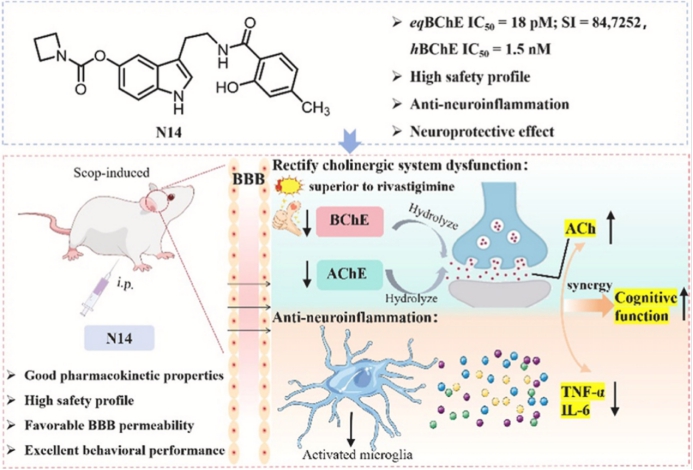 基于此概念,该团队以阿尔兹海默症(AD)入手,以团队原创具有完整知识产权N-水杨酰色胺类神经炎症抑制剂(NSTs)为“基座”,以阿尔茨海默症中晚期丁特异性靶标丁酰胆碱酯酶(BChE)为“弹头”成功设计合成一系列靶向阿尔茨海默症的新型双功能分子。其中,化合物N14表现尤为突出,对丁酰胆碱酯酶展现出“皮摩尔级” 的超高抑制活性(eqBChE IC50 = 18.00 pM; SI = 847,252),达到临床一线药物卡巴拉汀(Rivastigmine)的93倍。