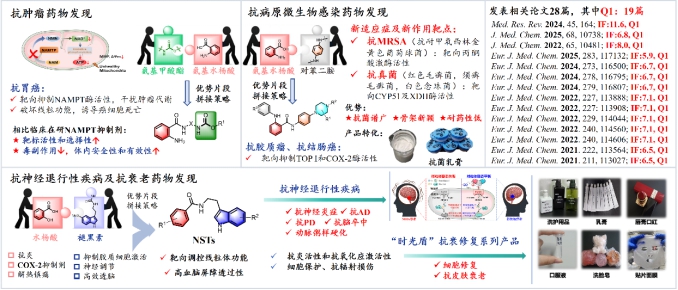 必威betway西汉姆药物设计与研发团队长期致力于基于片段的药物分子设计,以邻氨基苯甲酰为母核,融合具有良好成药性和明确定义靶点的药效片段,围绕肿瘤、病原微生物感染及神经退行性等重大疾病,发现了多个具备临床开发价值的抗真菌/细菌、抗胃癌、抗线粒体损伤相关性疾病的候选药物。目前,该团队正积极推进科技成果转化,依托自主成立的衡阳泽岐生物医药有限公司,在A轮融资的支持下完成了抗菌乳膏、修复面膜、抗菌日化品等多个品种的初步工艺研究,未来将开展下一轮的项目融资,全力推进产品落地应用。